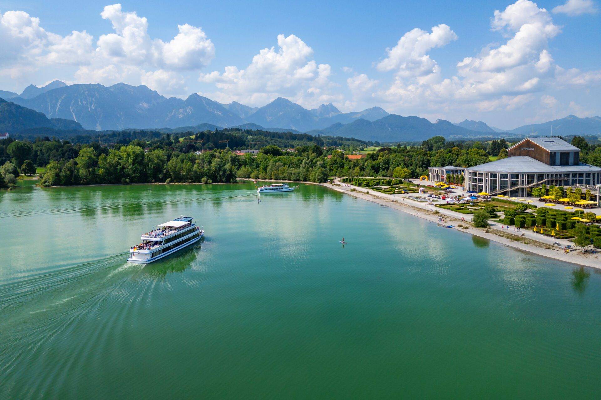 Mit bis zu 12 km Länge, 3 km Breite und fast 17 qkm Wasserfläche entstand so einer der größten bayerischen Stauseen. Mitte Juni erreicht er seinen normalen Wasserstand. Gemeindegebiete von Füssen, Halblech, Rieden, Roßhaupten, und Schwangau versanken im See. Am Kraftwerk an der Staustufe 1, nahe Roßhaupten, zeigt ein Informationszentrum Einzelheiten zu Ausbau und zur Technik.
